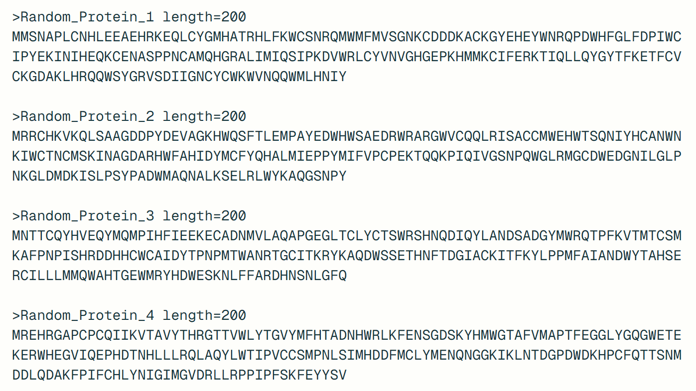 Generate random protein sequences with customizable length and amino acid composition. Include common motifs and control sequence properties for research and testing. This is a FASTA file generator.